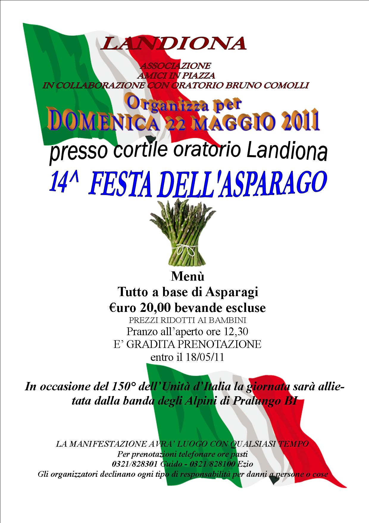 L'Associazione "Amici in piazza" in collaborazione con l'Oratorio Bruno Comolli organizza per DOMENICA 22 MAGGIO 2011 presso l'Oratorio di Landiona la 14^ FESTA DELL'ASPARAGO